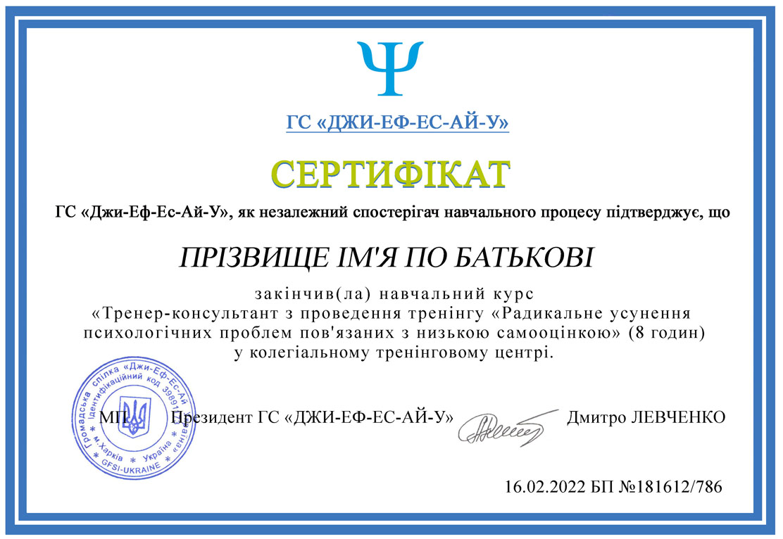 «Тренер-консультант з проведення тренінгу «Радикальне усунення психологічних проблем, пов'язаних з низькою самооцінкою»